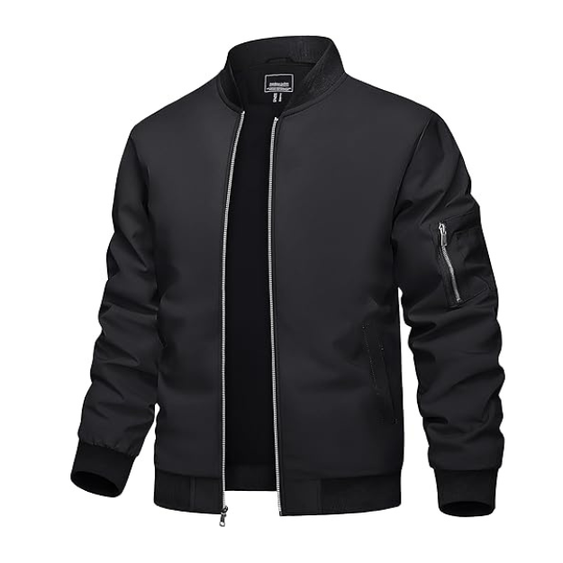 - Full zipper stand collar bomber jacket, The zipper head is on the left